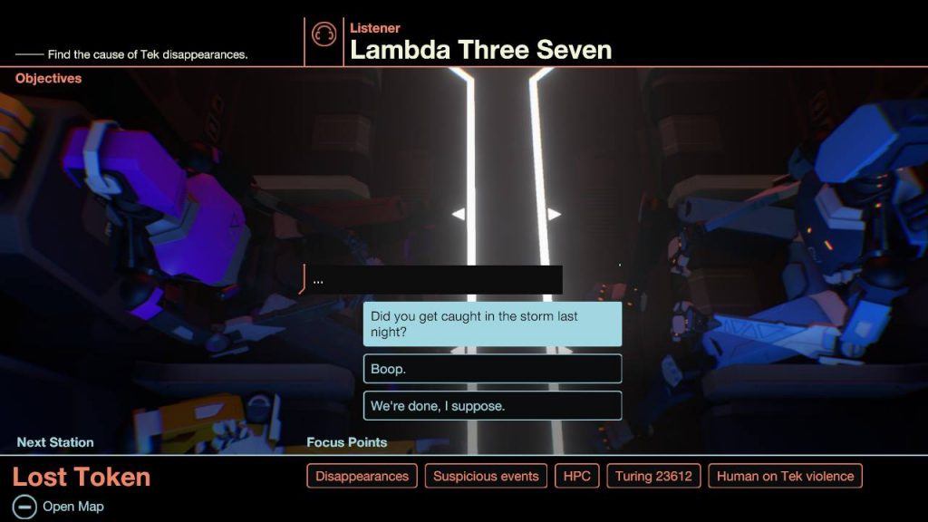 For example, one of the main questions you will be asking is, of course, about the disappearances. Each of the androids will react to it differently, stating either no knowledge about said event or how they themselves have been affected and happy they are that someone is finally looking into these occurrences. Some focus words are also only available momentarily as once that group have gotten off the train you no longer have a use for it in some cases.