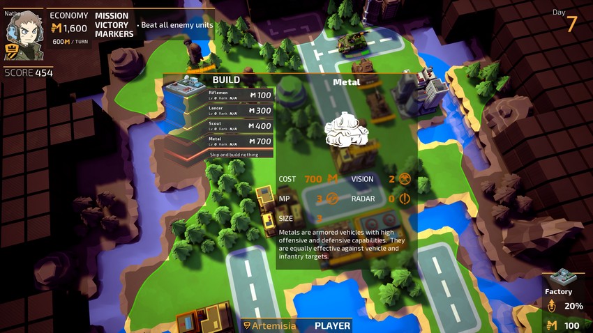 What first surprised me about Tiny Metal was its scale. I expected a simple, to-the-point TBT game, but the action is fleshed out with a remarkable amount of voiced dialogue and story. Perhaps too much. A war fought between two factions called Artemisia and Zipang, it’s all a little overblown and silly, though it at least avoids taking itself too seriously.