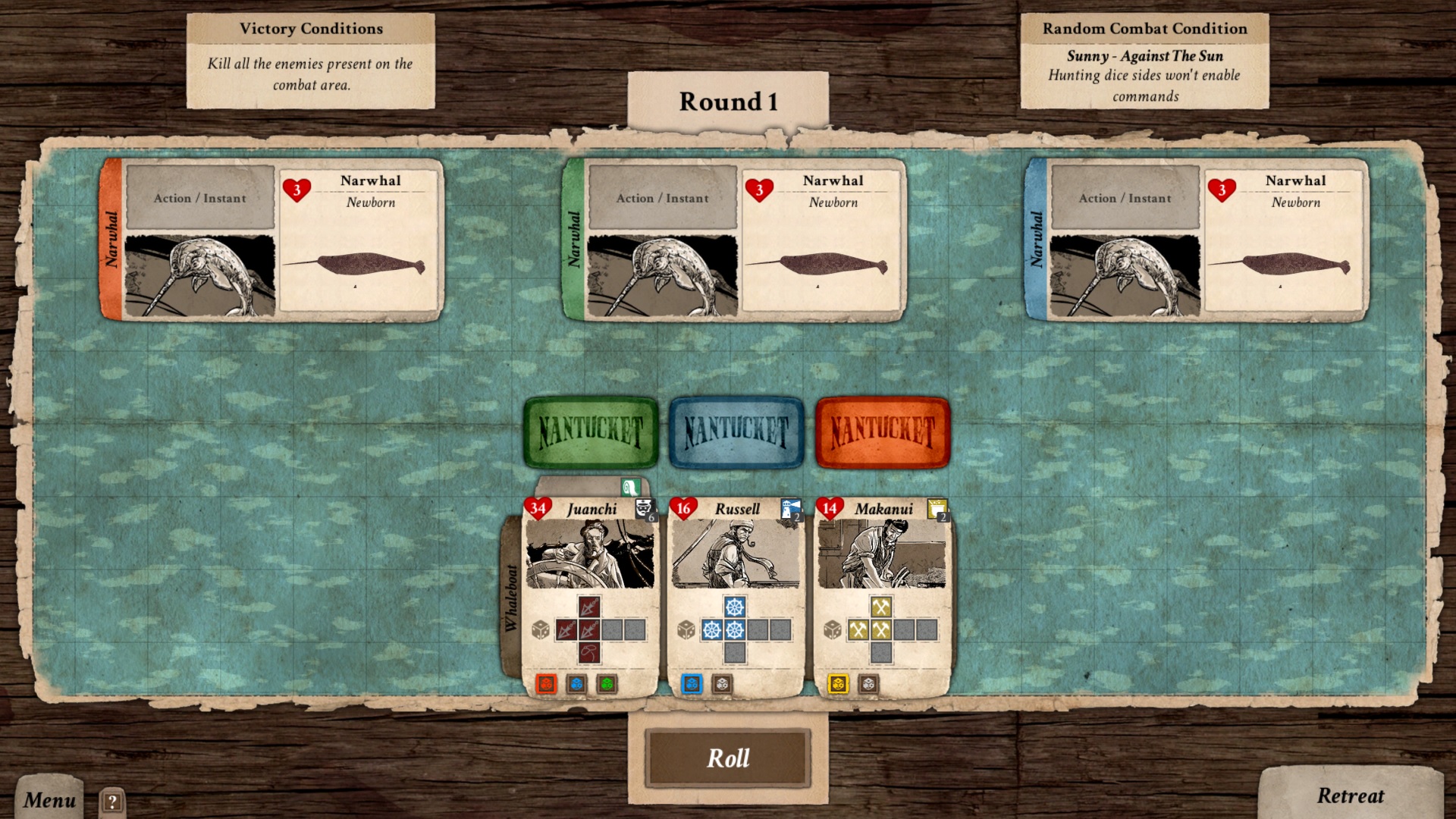 Combat is a dice-driven sequence where we will have to choose our better-fitted crew members to join us in the whaling boat (or just let them go without you, in which case at least one of them will probably die) and face either whales, pirates or “other” (spoiler-free term). Depending on which skills our team has, we will be able to select which type of dice we will use. We can use combat dice to harpoon or shoot our way out of danger; sailing dice to manoeuvre and repel attacks; science dice to heal or revive injured or dead allies; or crafting dice to, for example, reroll.