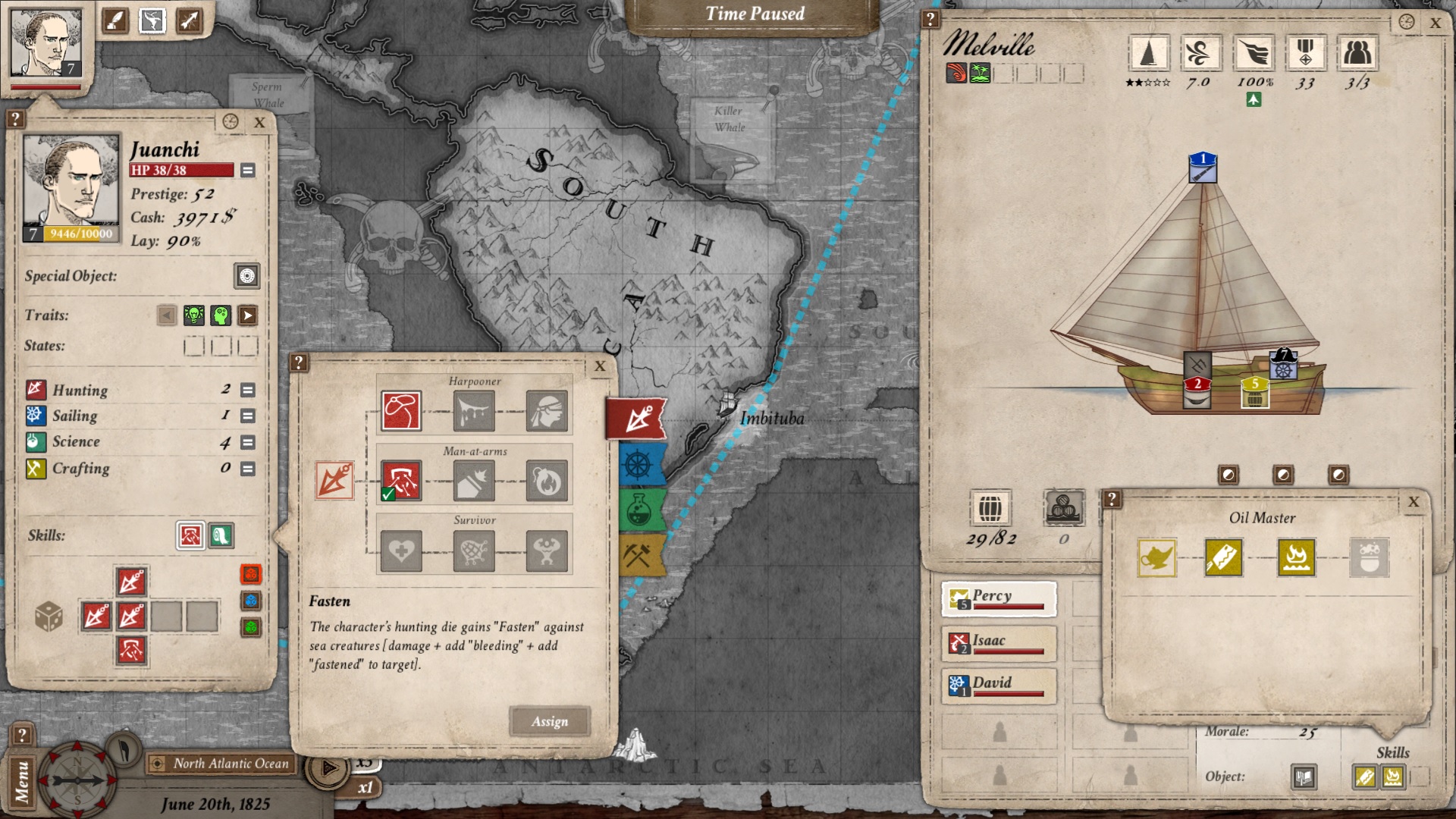 The first couple of hours on Nantucket fill the purpose of a tutorial on how to manage our resources (such as water, food, wood, grog and the main value object of the game, blubber), gather more of them, recruit new crew members and track assignments. We are presented with a map of the world, completely unexplored and with the promise of a rewarding exploration experience. Hunting different types of whales will be our main activity throughout the game, which will provide us with blubber to sell, food to keep our crew alive and experience to get new skills from a brief but solid skill tree.