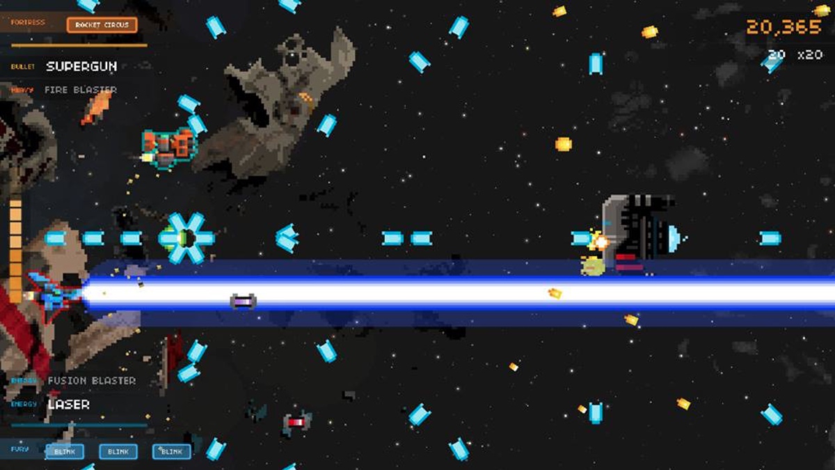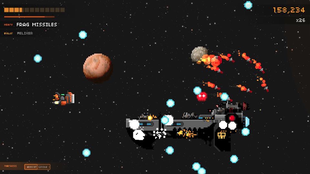 It’s all presented in bright colourful pixel art that sees your ship blasting through space across vibrant backdrops. The enemy designs do become repetitive, however. Worse, there’s often so much chaotic on-screen action that it’s easy to lose track of your ship. Playing co-operatively only exacerbates the problem. Then there’s the brilliantly raging, heavy metal soundtrack that ramps up the intensity further in what is already frantic bullet hell.