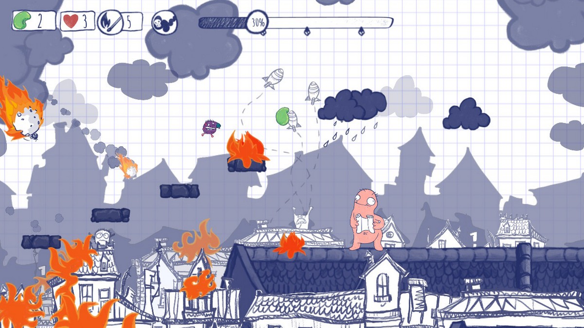 While there’s nothing groundbreaking about the way Escape Doodland plays, its style certainly sets it apart, for better or worse. This is a scribbly world of ragtag creatures, bizarre environments and gross toilet humour. But though it may be crude, Escape Doodland thrives on its wacky level design. A highlight is a level inside of a sea creature’s mouth, its long tongue a sort of red carpet, leading you towards wonky, rotting teeth platforms which creak and wobble as you jump on them.