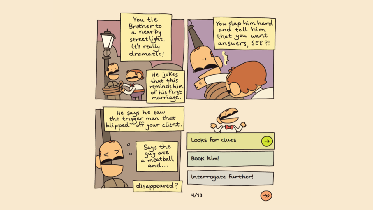 While some of Hop Dude Nights is played through amusingly drawn comic strips in which you choose from a series of options, it also has battles which play like a parodical RPG. Its visual style and surreal humour feel like a throwback to the early days of internet humour – simpler times. The bonus? You get to listen to a soundtrack of smooth jazz throughout. If that’s not a deal-closer, I don’t know what is.