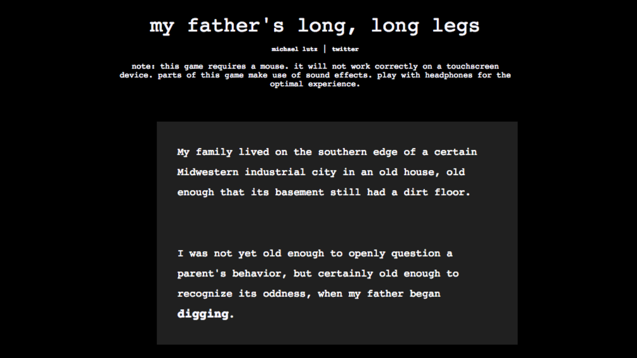 A tale of a family recounted from a young girl’s perspective, you click on bold text within the vivid descriptions to decide which rabbit hole to go down next. Before long, you realise there’s something not quite right in My Father’s Long Long Legs, but it does a good job of keeping that sense of mystery alive throughout.