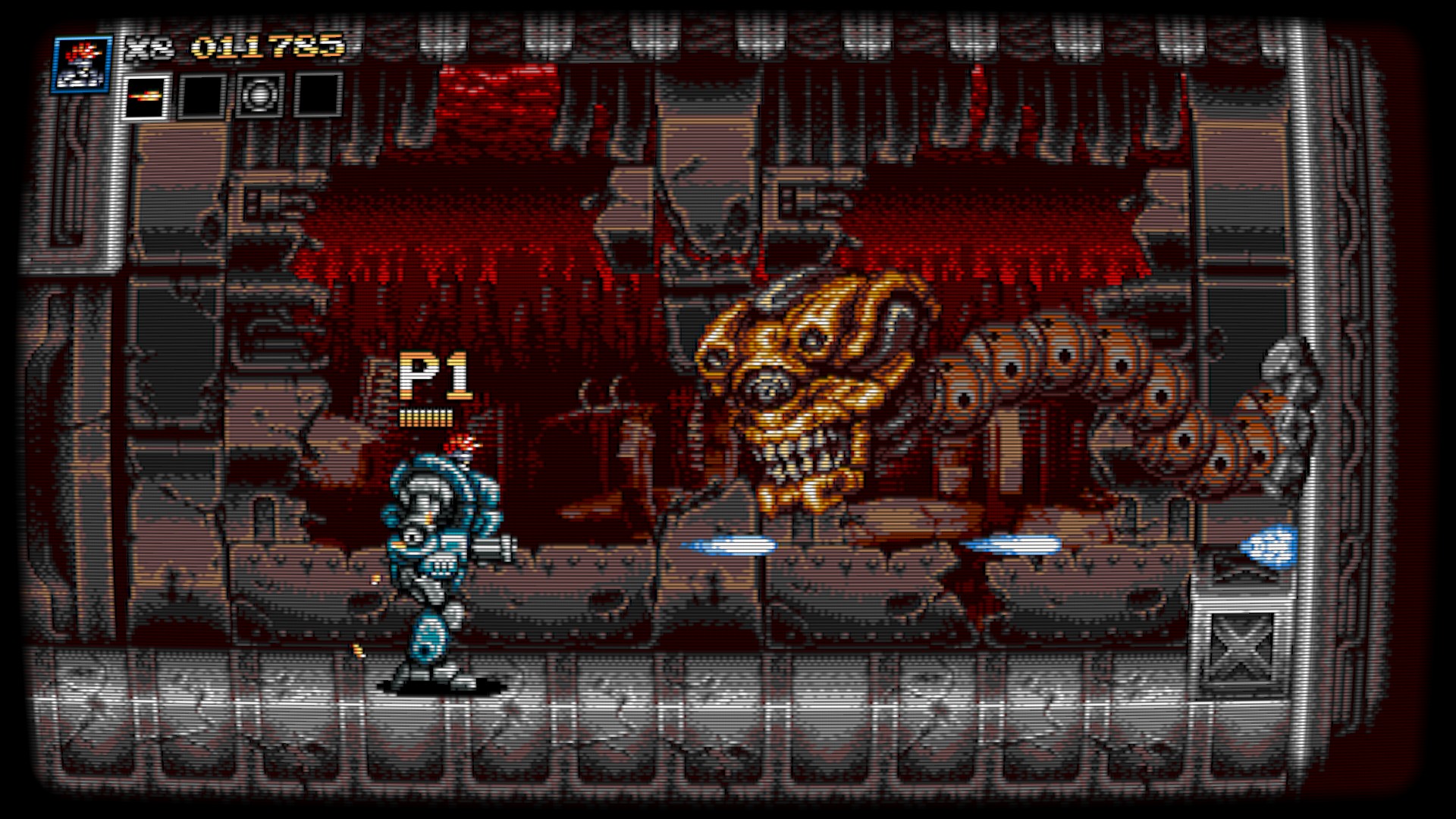 Compared to its inspirations, the only concession Blazing Chrome makes to modernity is that it gives you infinite continues on normal and easy difficulty modes. There’s no health system – you die with one hit. Normal mode starts you with five lives. Losing all lives kicks you back to a checkpoint – of which some levels have multiple, but checkpoints don’t actually save when you quit, so you have to beat each level in one go. Easy mode gives you a couple more lives and drops power-ups more often but that’s about it. And there’s no chaser weapon to ease the burden of aiming like in Gunstar Heroes or Cuphead. If Blazing Chrome has a Konami Code, I haven’t found it yet.