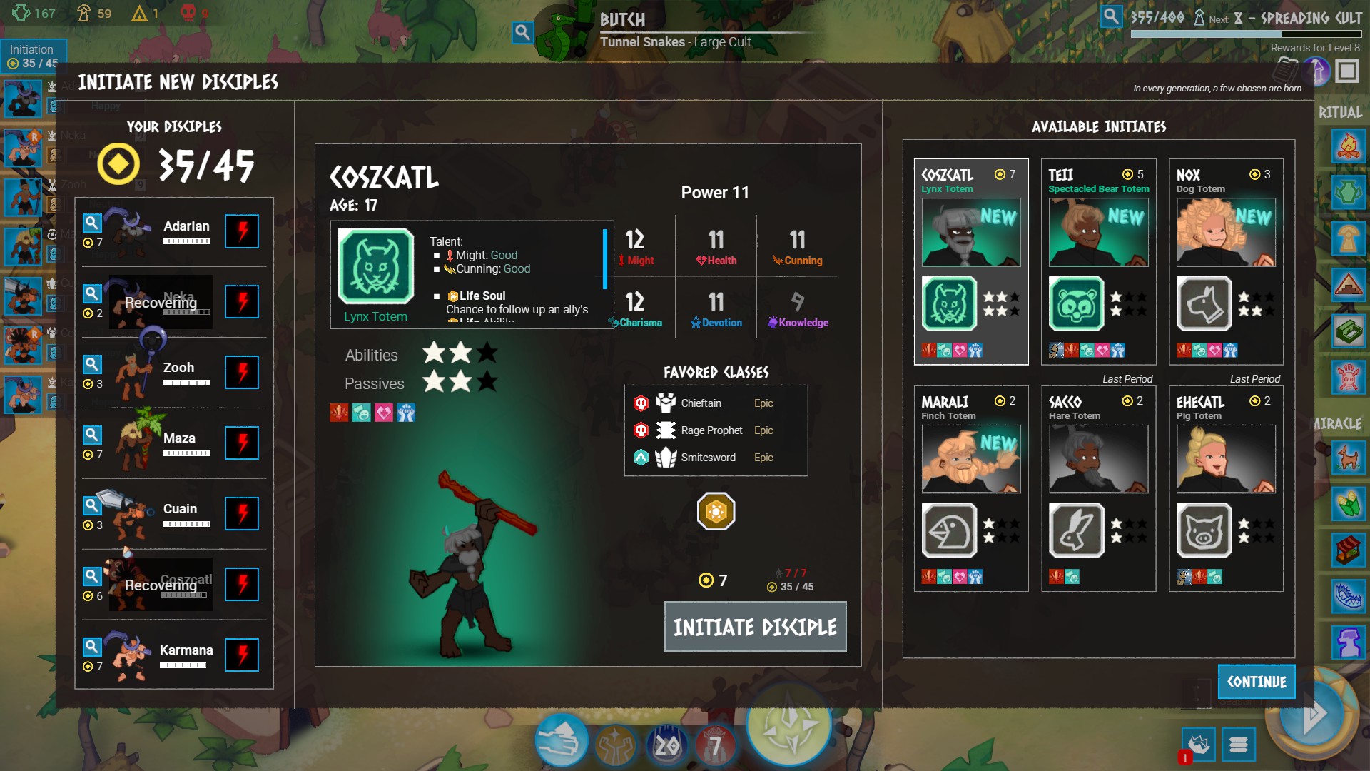 The Tunnel Snakes slowly but surely continued to grow from one banished follower to several hundred. Every 20 in-game days, a group of disciples rises from the gathering of followers to become warriors for the religion. The pool of disciples have randomized stats and don’t have much going for them until you train them. They’re almost as useless as the followers they came from until they get their class through battle.