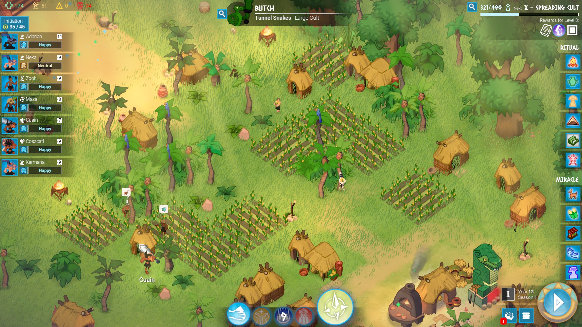 As the days progress in-game, your religion grows through different stages – from a small gathering to a large cult. While it’s satisfying to watch as new temples and structures expand your camp, your religion often feels automated due to most of the gameplay taking place without your interaction. Your disciples fight in combat without you and the success of their rituals are a dice roll.