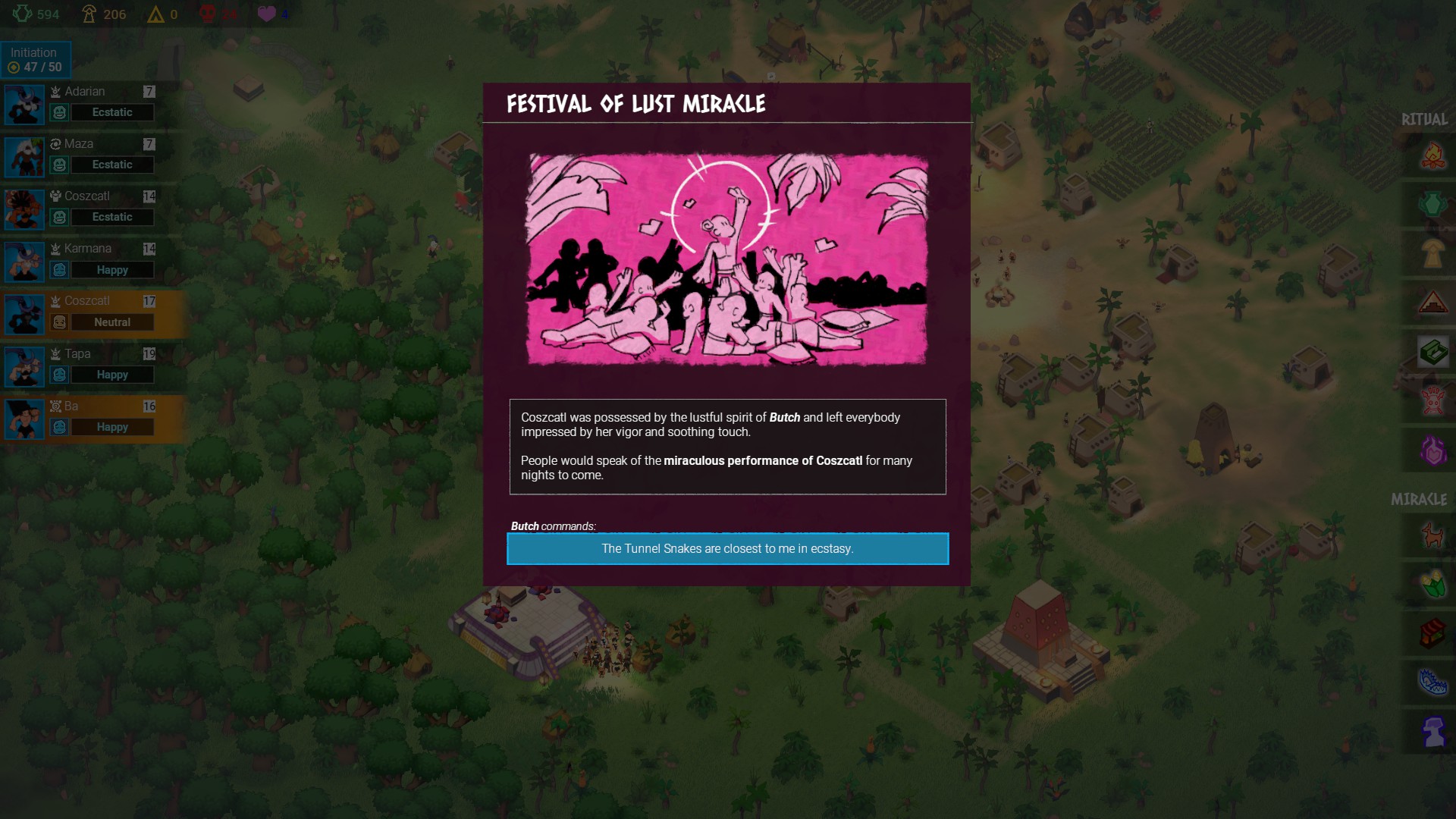 I cleared every area on the world map for new followers and the only way I could unlock content for my Lust commandment was through performing rituals to sluggishly gather followers. There’s little impetus to continue playing once the content has run dry. I gathered the followers anyway so I could unlock a Festival of Lust, another way for my disciples to upgrade their stats. Now they can proceed to do nothing since I already won.