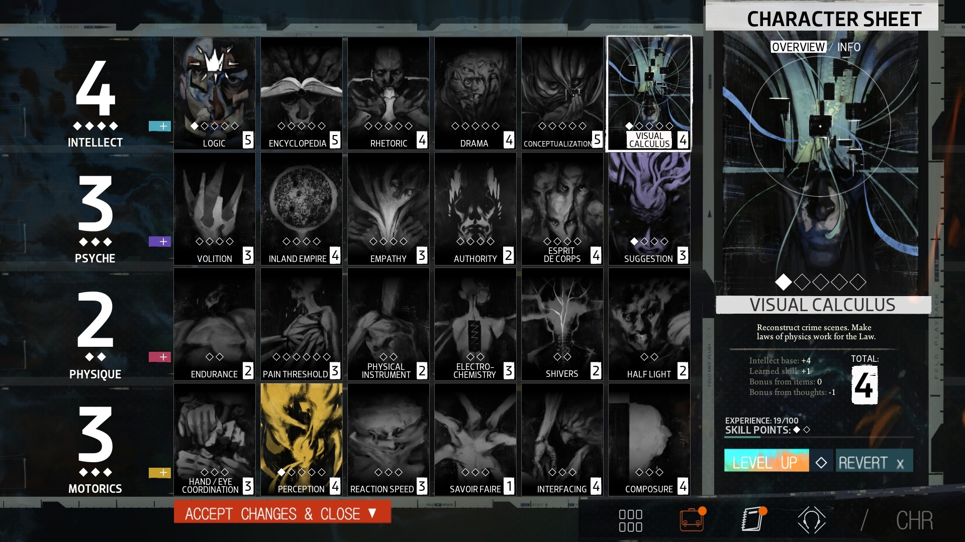 Each time you level up, you’ll receive a skill point. These have two uses: letting you unlock a new thought in your ‘Thought Cabinet’, or increasing an attribute on your character sheet. If you want to try a new thought, go ahead – these are largely unpredictable and can have interesting results. But as for increasing attributes, it can pay off to wait until a particular one is needed.