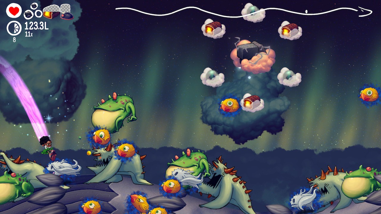 Pick your protagonist and the run begins with you facing your first space dragon. Starting at the tail end, you run across their undulating body, jumping on enemies, finding powerups to use and gathering valuable collectibles. Make it to the end, and you have a limited time to stab the space dragon in the head with your sword or spirit power. You’ll then free-fall through the outer layers of the Earth’s atmosphere, looking for new dragons to fight and eventually making your way down to Earth itself – if you survive long enough.