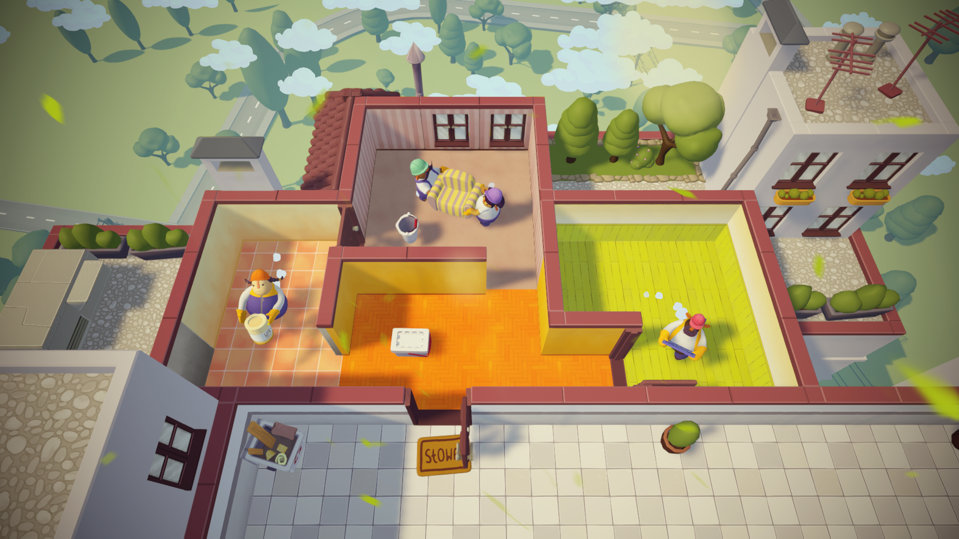 Piles of garbage oddly cause the same reaction and it quickly becomes obvious the developers did this on purpose to make us hate them, the other players, and ultimately ourselves. See, those rotund contractors you play? They’re round largely to make sure they get in each other’s way, so that if two are trying to pass each other and there’s a paint can, you can’t help but trip over it.