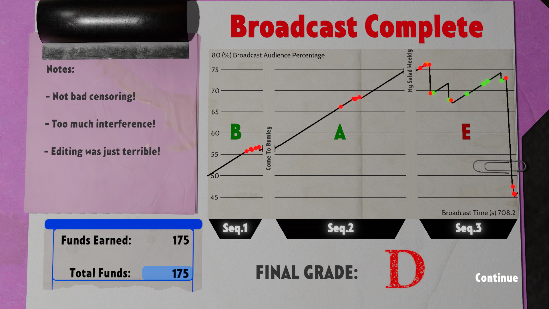The bonus with my former job is that in teleshopping, it was easy to pull back from mistakes by simply taking a breather and getting ahead of yourself. Not For Broadcast has so much happening to keep the game engaging that too many mistakes that fudge the broadcast can see you getting fired, or pushing an agenda on the audience, whether intentional or not.