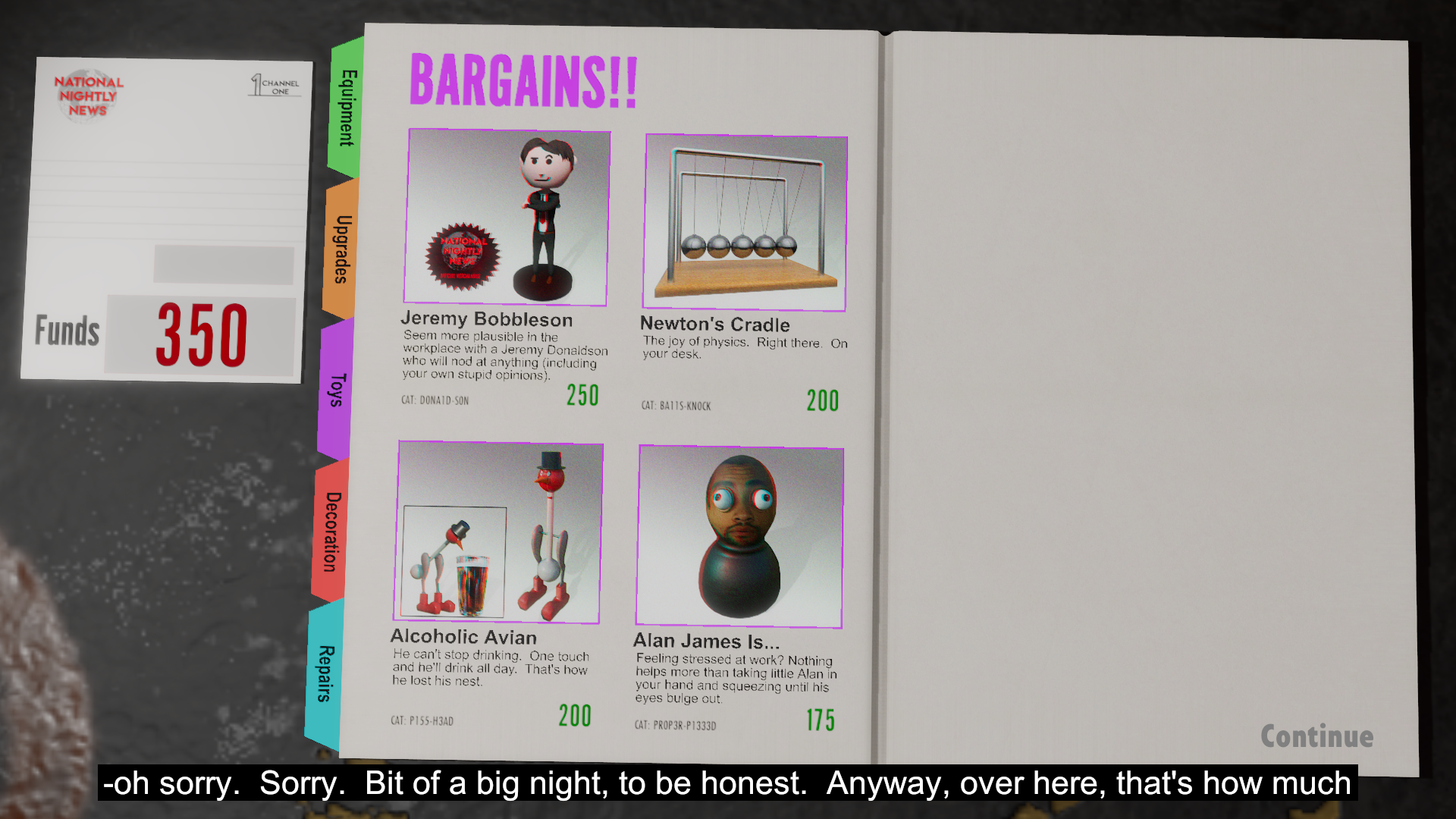 The added bonus of being given control of a fake broadcast means that I can finally fulfil my dream of purposefully smashing every button on the desk during a broadcast. After 7 hours of directing, sometimes those buttons taunt you, but you can’t risk being fired. Thankfully you can, just like my old studio used to do, purchase fun items such as stress balls, or bobbleheads to spruce up the working area — We used to order pizza too, but you can’t do that in the game.