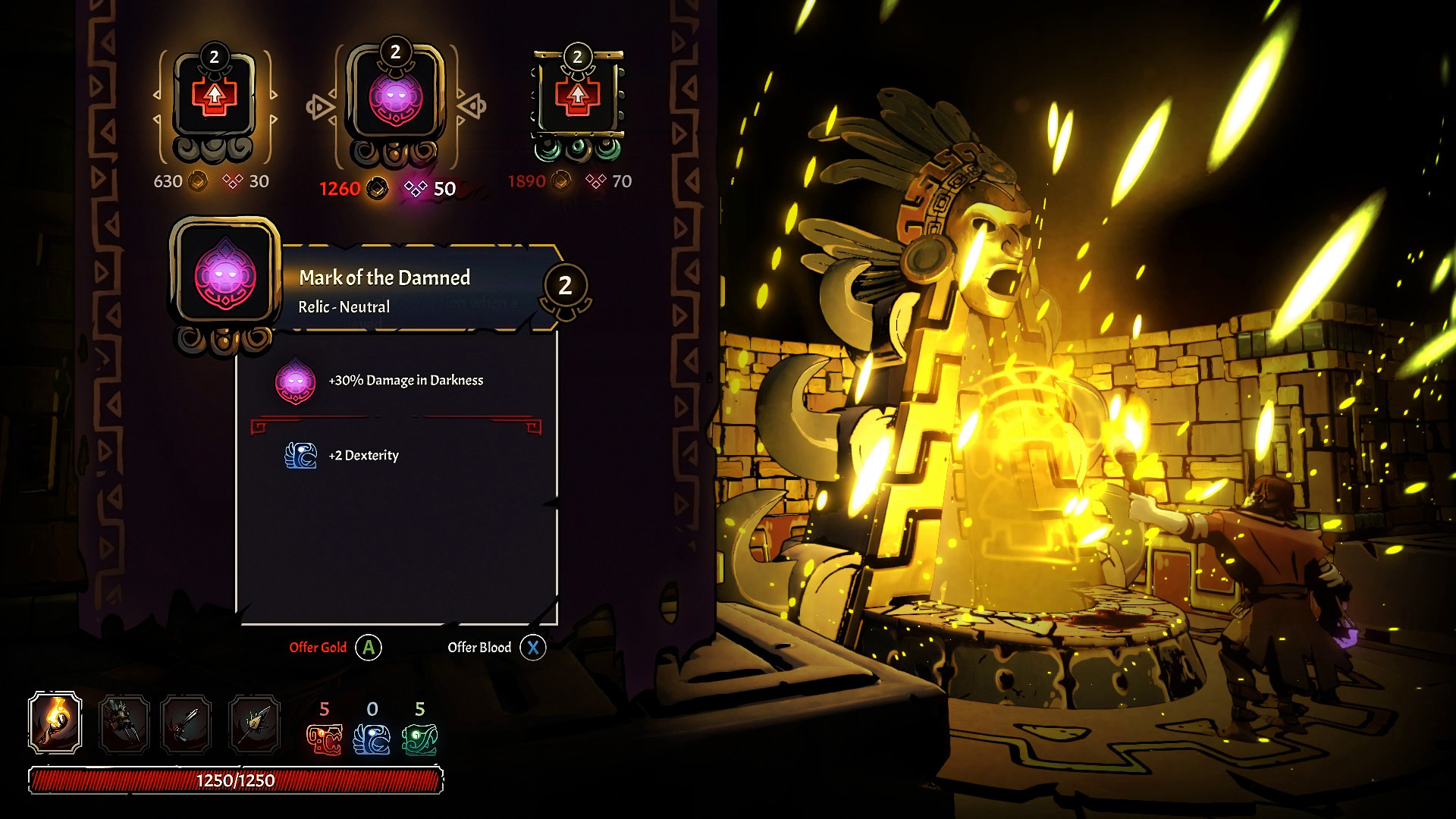 As you defeat enemies, some will drop relics and these act as stat boosts, improving your constitution or maximum health as one example. Harder foes drop crystal skulls instead, which can be used to unlock blessings that remain with you even after death, such as traps dealing extra damage to enemies, light sources illuminating further distances and reduction in damage to your character. These are limited though, and you can only use one, with extra slots becoming available after defeating champions.