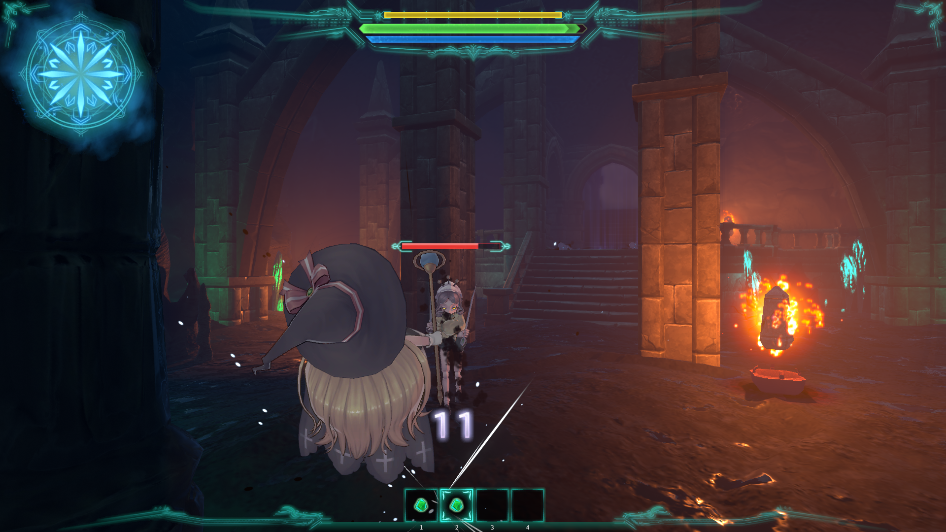 The first boss you face is a haunted suit of armour, but from then on out Little Witch Nobeta heads in a completely different direction. This battle is a good enough start, teaching you that you must aim you spells at specific body parts, that you need to run and keep your distance, and how to deal with the various supercharged attacks the bosses throw at you. But… it’s a big suit of armour. In a castle. Not the most inspired choice.
