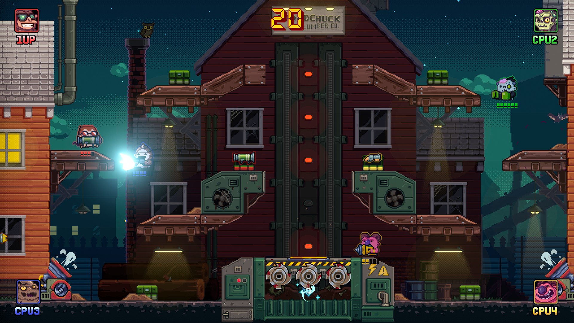 Whilst its hand-crafted levels feature some unique elements like a central lift with saws on it, a train that flattens anyone caught at the bottom, portals, powerups, etc, they still feel like small flirtations with variation. Weapons too threaten to be interesting with walking bombs reminiscent of the Worms series and driller-heads that can travel straight through any wall/platform, but it leaves the creativity there. Kills are almost too easy and fast and arenas too simple and open to allow any room for fine-strategy or the environmental variation to mean much.