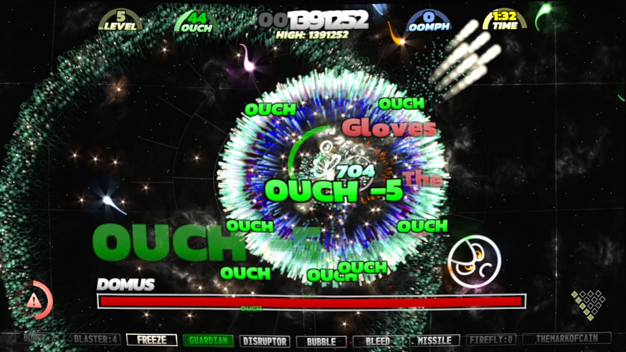 Not something you expect a boss to shout at you, but players of Bezier will come to expect it. The game’s a twin-stick shooter that can best be described as Geometry Wars if it lost its mind. Your spaceship even looks similar to the one in Geometry Wars, with the weird little claw-shaped cockpit and long glowing tail.