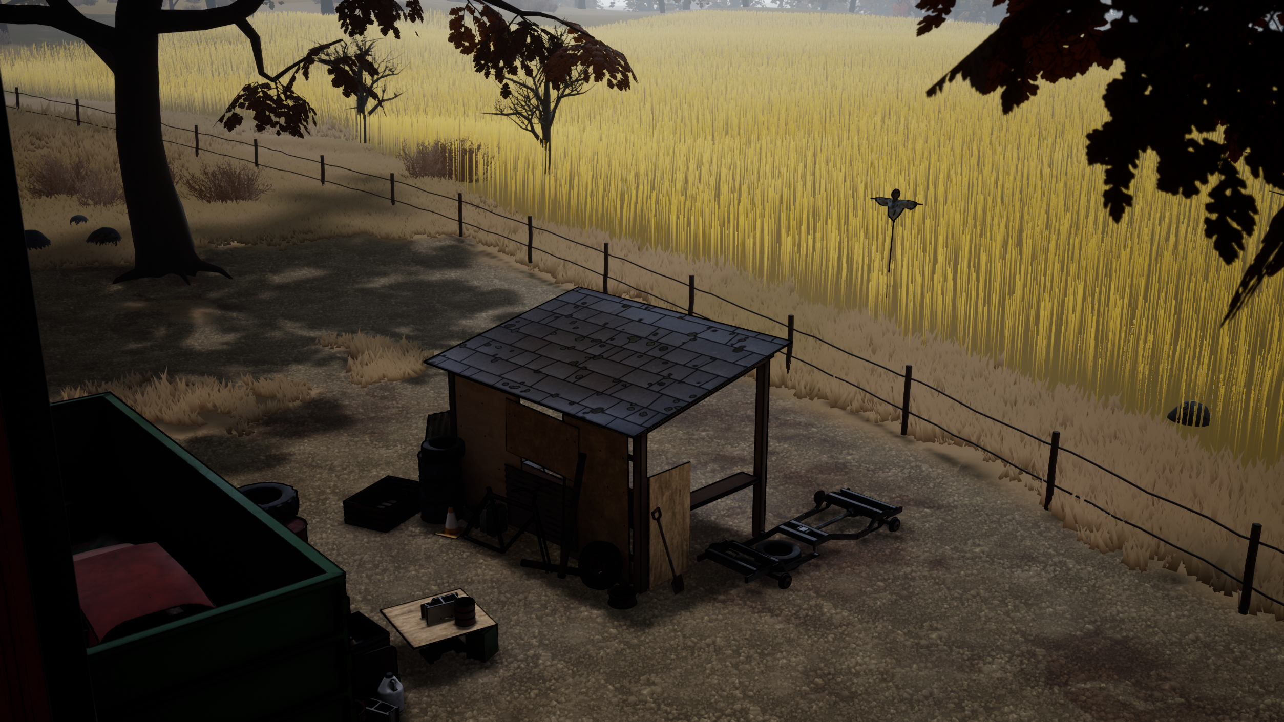 The setting is as much of Adios’s identity as the story. Looking past the farmhouse is flat land and trees extending to, seemingly, infinity. Power lines reign tall like skyscrapers over the browns, yellows, and reds of the game’s palette.